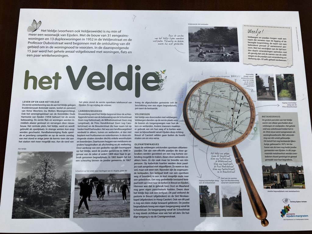 Het Veldje was doorsneden met veldwegen. Veldwegen dienden op de eerste plaats voor de boeren als toegangswegen naar hun akkers en weilanden. Andere inwoners maakten er gebruik van om hun weg af te korten wanneer ze bijvoorbeeld vanuit Eijsden-dorp richting Breust of Caestert wilden gaan buiten de hoofdstraten om en vice versa. Het gehele veld was onbebouwd totdat het in de 20ste eeuw werd aangewezen als woningbouwlocatie. Met uitzondering van één uniek gebouwtje. Dit betreft het nog bestaande lijkenhuisje, gebouwd in 1875, ten behoeve van de toen nog beide joodse gemeenten van Eijsden. In dit zogenaamde metaheerhuis werden overledenen ritueel gereinigd en gereedgemaakt voor hun begrafenis. Veldwegen en paadjes kregen vaak een naam die verwees naar de ligging of de beoogde looprichting, de naam van een belendend perceel of aanwonend persoon. Met het verstrijken van de tijd konden daarin veranderingen optreden met als gevolg dat ook de namen van de veldwegen en de paadjes aan verandering onderhevig zijn. Of zelfs geheel verdwenen.