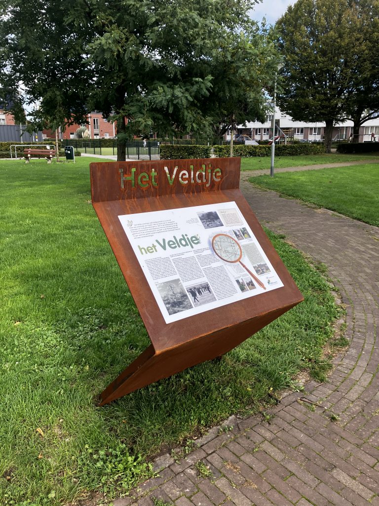 Aan de zuidzijde tegenover het woningcomplex ‘De Korenbloem’ staat het infobord over de ontsluiting van het gebied met de naam “Het Veldje”.