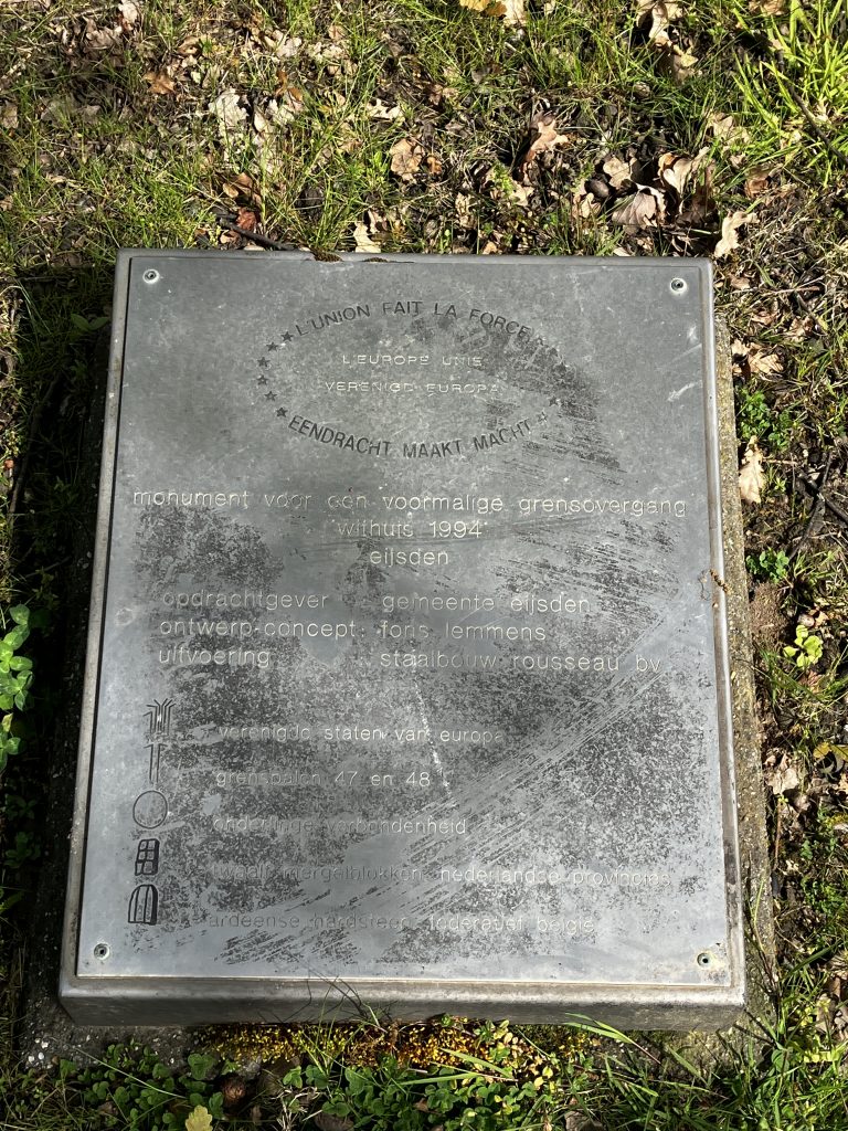 ![]() | L`UNION FAIT LA FORCE L`EUROPE UNIE VERENIGD EUROPA EENDRACHT MAAKT MACHT Monument voor een voormalige grensovergang withuis 1994 eijsden Opdrachtgever : gemeente eijsden Ontwerp-concept: fons lemmens Uitvoering : staalbouw rousseau bv Verenigde staten van europa Grenspalen 47 en 48 Onderlinge verbondenheid Twaalf mergelblokken – nederlandse provincies Ardeense hardsteen – federatie belgie |