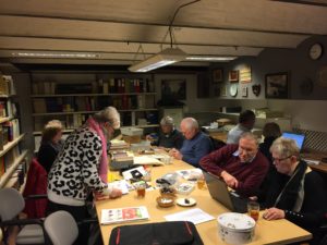 In de winterperiode is er iedere dinsdag en elke veertien dagen in de even weken ook op woensdagmiddag een werkmiddag, waarop de medewerkers naar believen bij elkaar komen.  We duiken in het verleden van Eijsden, werken aan de collecties, beantwoorden vragen, beschrijven foto’s, ordenen de bibliotheek, registreren we bidprentjes, onderhouden we de onderlinge contacten etc. etc.. De koffie staat altijd klaar en in een rustige ambiance wordt met veel gezelligheid gewerkt.